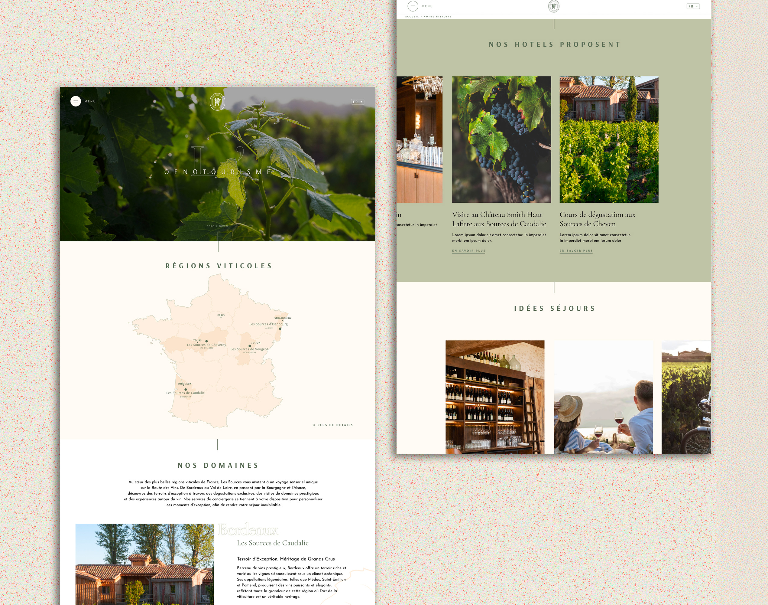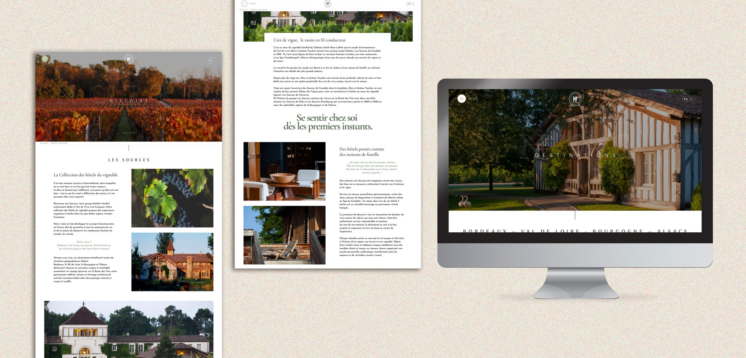 Création du design du site du groupe hôtelier Les Sources de Caudalie, puis déclinaison sur les quatre établissements du groupe.